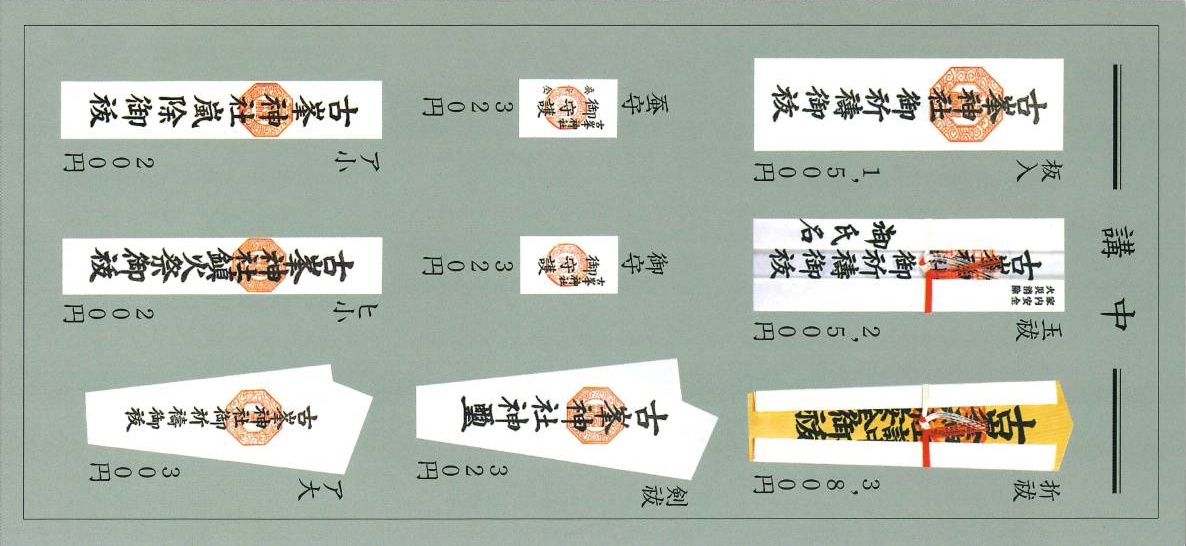 祈祷神符、御守、縁起物は社務所でお求めいただくほか、ご来山できない方には郵送でもお受けしております。